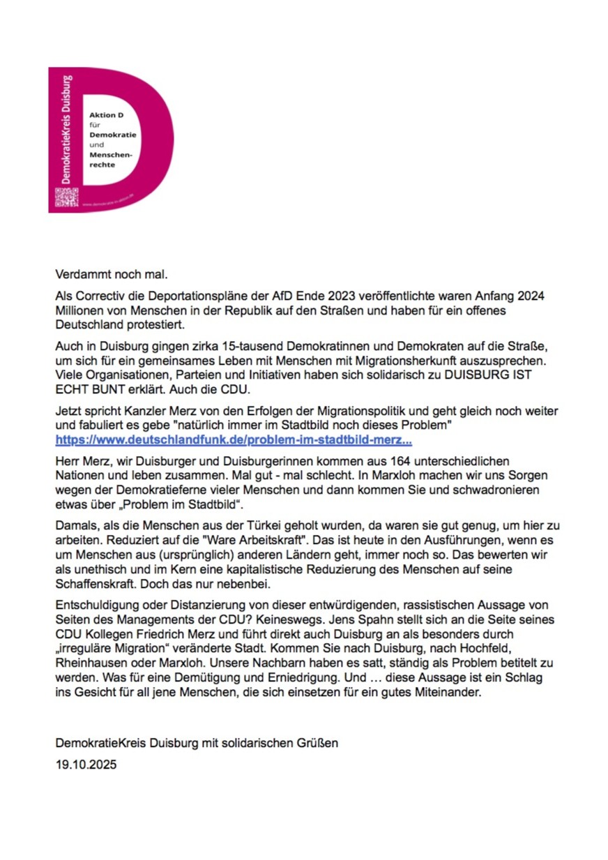 Der DemokratieKreis Duisburg ist keine Partei sondern eine Initiative. Wir sind Menschen aus Duisburg, unterschiedlicher Herkunft, Lebensweisen, Religionszugehörigkeit. Wir sind alt und jung, noch in der Schule, berufstätig oder im Ruhestand, schon politisch aktiv oder noch nicht …