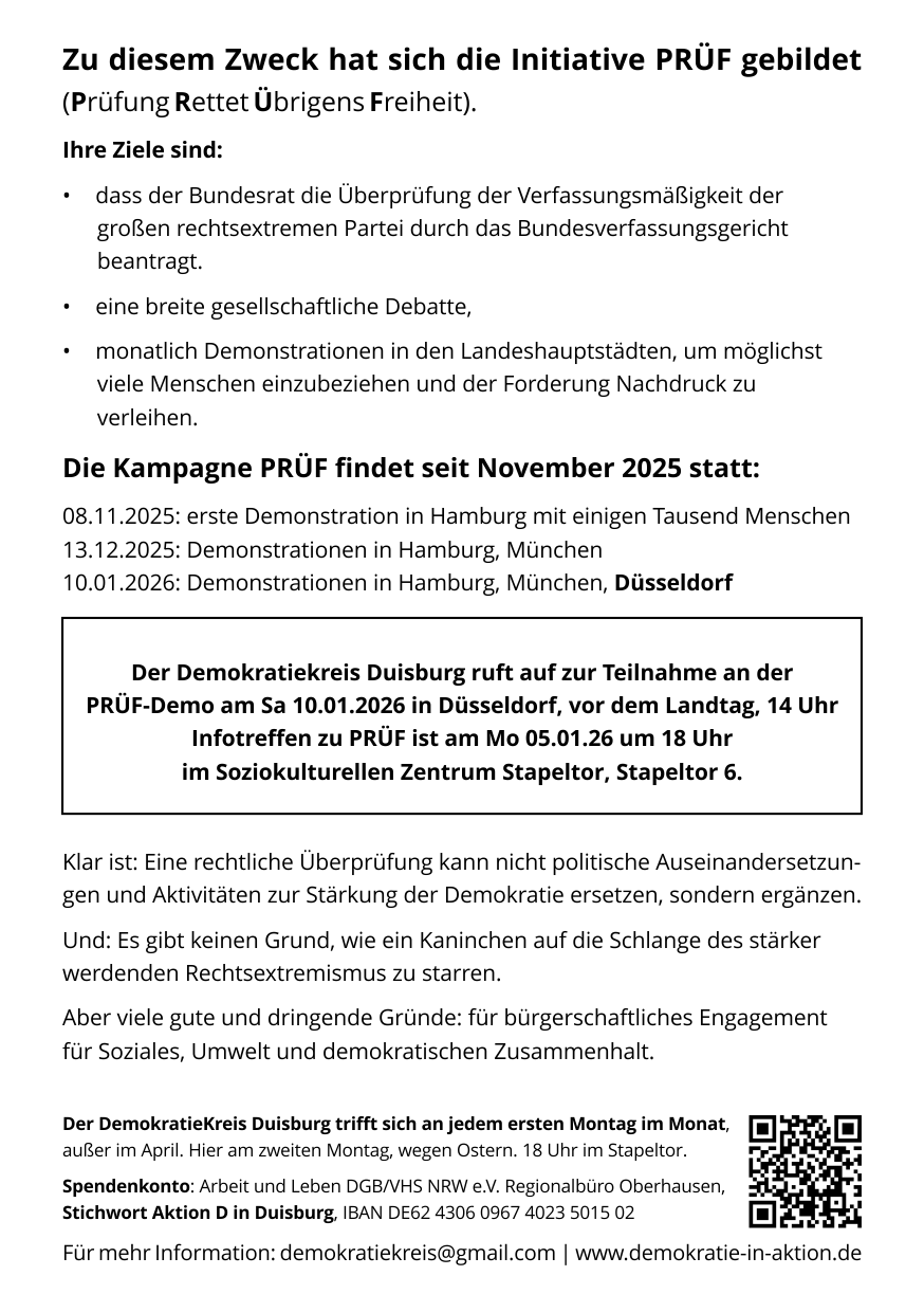 Liebe Menschen in Duisburg, denen Demokratie am Herzen liegt! Die aktuellen Wahlerfolge und steigenden Umfragewerte rechtsnationaler Parteien und Gruppierungen haben uns entsetzt und machen vielen Menschen in der Republik große Sorgen. Wir vom DemokratieKreis Duisburg wollen auf kommunaler Ebene deutliche Zeichen setzen für Demokratie und Menschenrechte.